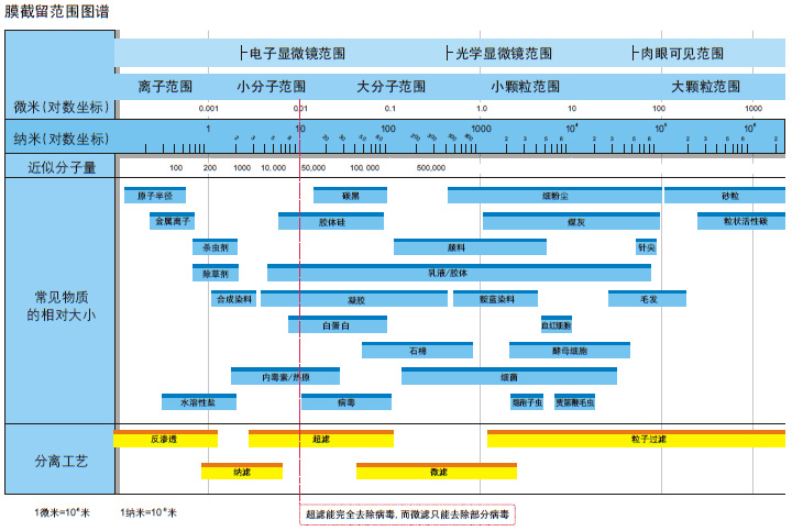 超濾膜的微孔徑在0.002-0.1μm之間,超濾膜分離過程是一種與膜孔徑大小相關的篩孔分離過程,以膜兩側的壓力差為驅動力,以超濾膜為過濾介質,即在一定壓力作用下,當含有大、小分子溶質的混合溶液流過膜表面時,溶劑和小分子溶質(如無機鹽類)將透過膜。大分子溶質則由于體積大于膜孔徑而被膜截留,作為濃縮液被回收。因而實現對原液的凈化、分離和濃縮的目的。參見上圖。 原液一般指需要凈化、分離或濃縮的溶液,透過液指原液中透過超濾膜而被濾除大分子溶質的那部分液體,濃縮液則是原液中因分離出透過液而剩余的高濃度溶液。在凈化水工程中,原液是指原水進水,透過液即為凈化水,濃縮液則是排放的廢水。 二、超濾膜的參數 從下表中可以看出,在膜法分離技術中膜的微孔徑在0.002-0.1μm之間的過濾膜稱為超濾膜,而一般膠體體積均≥0.1um,乳膠≥0.5um,大腸菌、葡萄球菌等細菌體積≥0.2um,懸浮物、微粒子等體積≥5um,因此超濾膜可以過濾出溶液中的細菌、膠體、懸浮物、蛋白質等大分子物質。