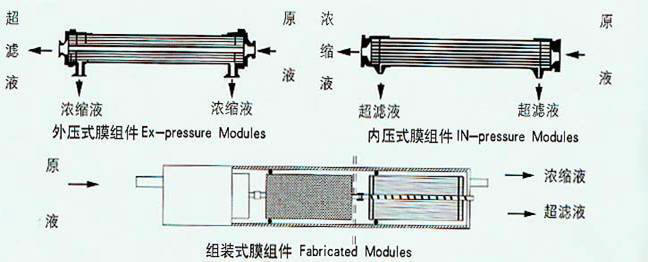 超濾是一種不對稱半透過薄膜,常用材料有醋酸纖維素膜(CA)、聚砜膜(PS)、聚丙烯膜(PAN)等。在一定的壓力下,水在膜表面上流動,水與溶解鹽和其它電解質等微小顆粒能透過超濾膜,而蛋白質、各類酶、細菌、病毒、乳膠、熱源與其它分子量大的顆粒和膠體物質被超濾膜阻擋,從而使水中的部分微粒得到分離、濃縮。超濾膜孔徑為 0.1-0.002µm ,介于反滲透與微孔膜之間。 超濾裝置是根據生產的要求,采用相應截留分子量的超濾膜進行工藝流程設計。超濾分離在常溫、低壓下運行無相態變化,膜不易阻塞,操作極為方便。